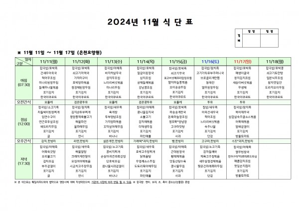11월 둘째주 식단표 페이지 정보 작성자 은천노인복지회 작성일24-11-07 16:50 조회18,085회 댓글0건 관련링크 이전글 다음글 목록 답변 본문 . 이전글 다음글 목록 답변
