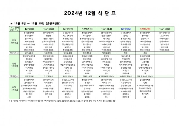 12월 둘째주 식단표 페이지 정보 작성자 은천노인복지회 작성일24-12-06 09:42 조회17,194회 댓글0건 관련링크 이전글 다음글 목록 답변 본문 . 이전글 다음글 목록 답변