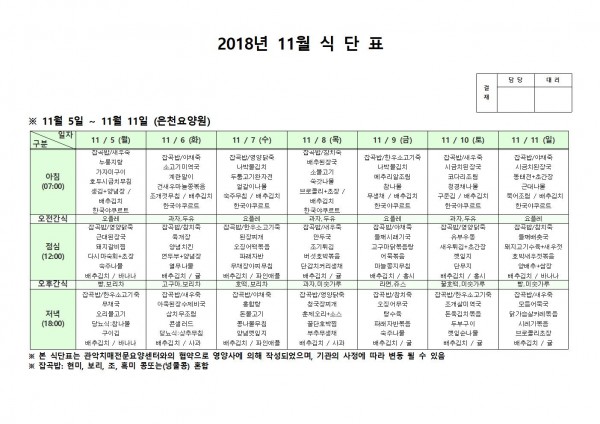 11월 1주째 식단표 페이지 정보 작성자 은천노인복지회 작성일18-12-07 09:37 조회204,653회 댓글0건 관련링크 이전글 다음글 목록 답변 본문 11월 1주째 식단표 이전글 다음글 목록 답변