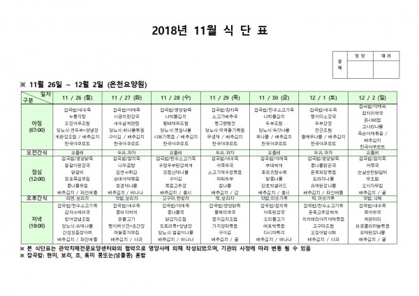 11월 4주째 식단표 페이지 정보 작성자 은천노인복지회 작성일18-12-07 09:38 조회206,077회 댓글0건 관련링크 이전글 다음글 목록 답변 본문 11월 4주째 식단표 이전글 다음글 목록 답변