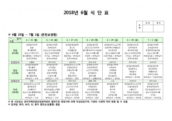 6월 다섯째주 식단표 페이지 정보 작성자 은천노인복지회 작성일18-07-09 16:45 조회208,112회 댓글0건 관련링크 이전글 다음글 목록 답변 본문 6월 다섯째주 식단표 이전글 다음글 목록 답변
