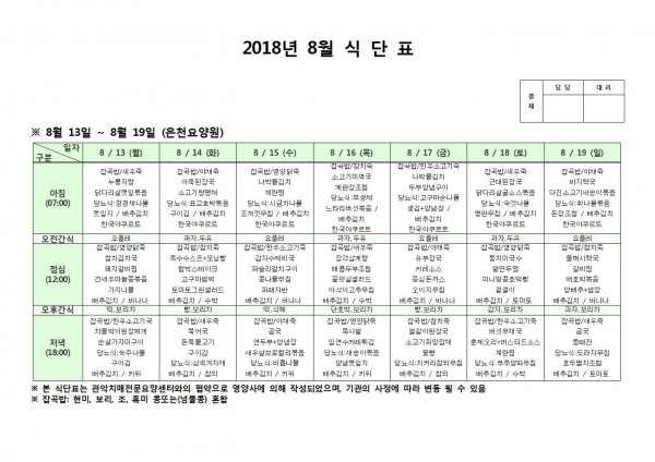 8월 셋째주 식단표 페이지 정보 작성자 은천노인복지회 작성일18-08-27 09:47 조회203,884회 댓글0건 관련링크 이전글 다음글 목록 답변 본문 8월 셋째주 식단표 이전글 다음글 목록 답변