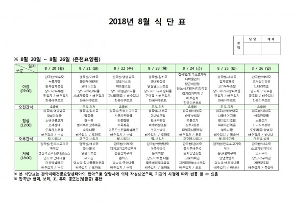 8월 넷째주 식단표 페이지 정보 작성자 은천노인복지회 작성일18-08-27 14:01 조회204,630회 댓글0건 관련링크 이전글 다음글 목록 답변 본문 8월 넷째주 식단표다 이전글 다음글 목록 답변