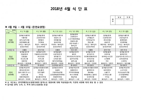 4월 둘째주 식단표 페이지 정보 작성자 은천노인복지회 작성일18-04-09 15:02 조회197,972회 댓글0건 관련링크 이전글 다음글 목록 답변 본문 4월 둘째주 식단표 이전글 다음글 목록 답변