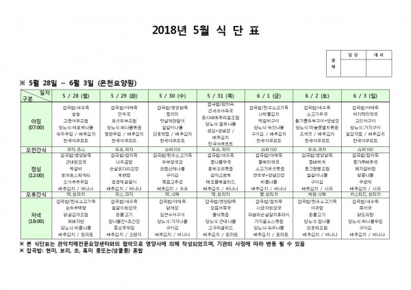 5월 다섯째주 식단표 페이지 정보 작성자 은천노인복지회 작성일18-06-07 10:39 조회203,952회 댓글0건 관련링크 이전글 다음글 목록 답변 본문 5월 다섯쨰주 식단표 이전글 다음글 목록 답변