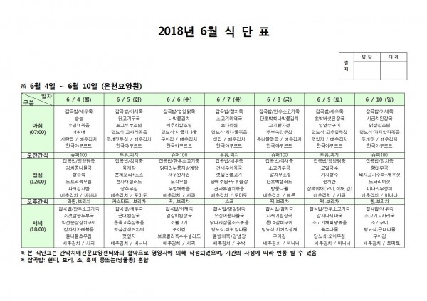 6월 둘째주 식단표 페이지 정보 작성자 은천노인복지회 작성일18-06-11 14:23 조회204,258회 댓글0건 관련링크 이전글 다음글 목록 답변 본문 6월 둘째주 식단표 이전글 다음글 목록 답변
