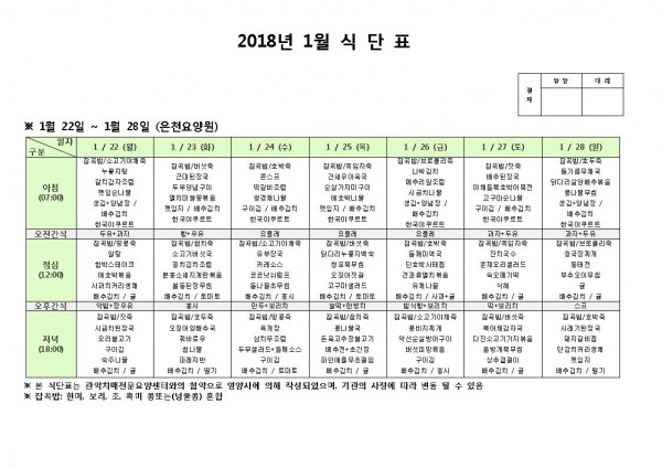 1월 넷째주 식단표 페이지 정보 작성자 은천노인복지회 작성일18-01-24 11:07 조회192,564회 댓글0건 관련링크 이전글 다음글 목록 답변 본문 1월 넷째주 식단표 이전글 다음글 목록 답변
