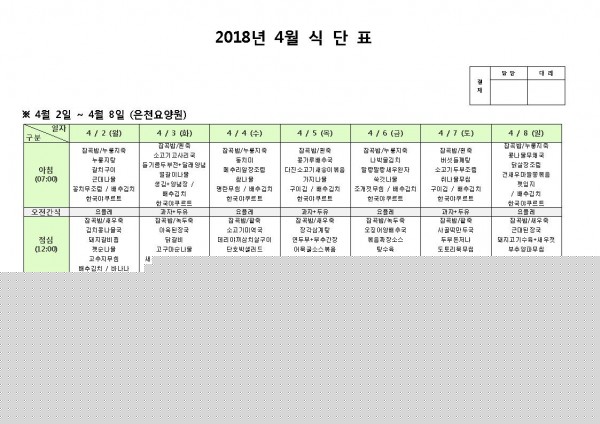 4월 첫째주 식단표 페이지 정보 작성자 은천노인복지회 작성일18-04-02 15:32 조회197,093회 댓글0건 관련링크 이전글 다음글 목록 답변 본문 4월 첫째주 식단표 이전글 다음글 목록 답변