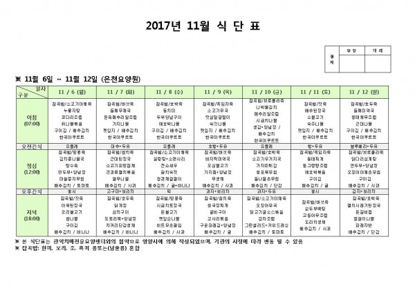11월 둘째주 식단표 페이지 정보 작성자 은천노인복지회 작성일17-11-09 10:44 조회183,375회 댓글0건 관련링크 이전글 다음글 목록 답변 본문 11월 둘째주 식단표 이전글 다음글 목록 답변