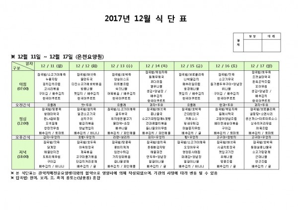 12월 셋째주 식단표 페이지 정보 작성자 은천노인복지회 작성일17-12-11 10:18 조회186,889회 댓글0건 관련링크 이전글 다음글 목록 답변 본문 12월 셋째주 식단표 이전글 다음글 목록 답변