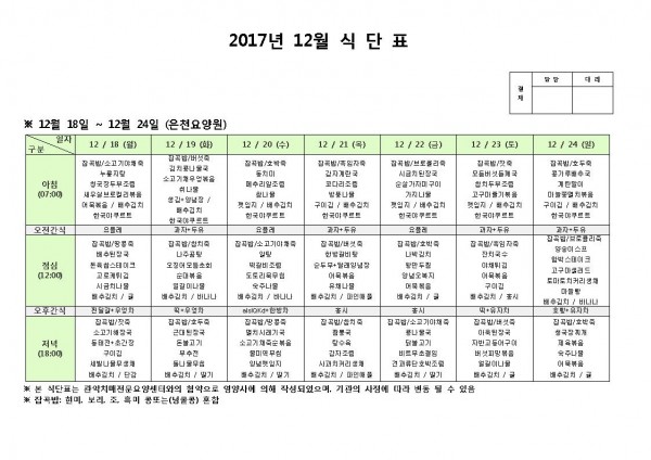 12월 넷째주 식단표 페이지 정보 작성자 은천노인복지회 작성일17-12-18 16:58 조회188,726회 댓글0건 관련링크 이전글 다음글 목록 답변 본문 12월 넷째주 식단표 이전글 다음글 목록 답변