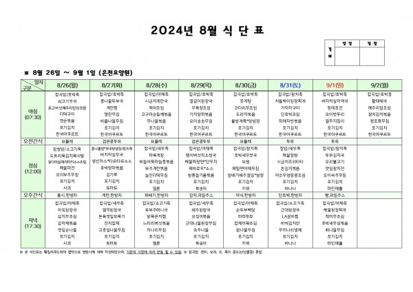 8월 다섯째주 식단표 페이지 정보 작성자 은천노인복지회 작성일24-08-23 11:34 조회20,899회 댓글0건 관련링크 이전글 다음글 목록 답변 본문 . 이전글 다음글 목록 답변