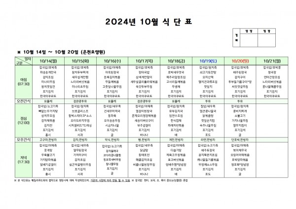 10월 셋째주 식단표 페이지 정보 작성자 은천노인복지회 작성일24-10-11 16:45 조회18,738회 댓글0건 관련링크 이전글 다음글 목록 답변 본문 . 이전글 다음글 목록 답변