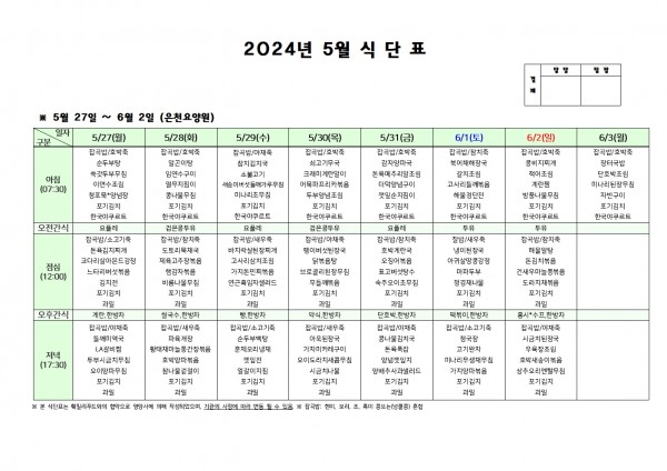 5월 다섯째주 식단표 페이지 정보 작성자 은천노인복지회 작성일24-05-24 16:18 조회24,327회 댓글0건 관련링크 이전글 다음글 목록 답변 본문 . 이전글 다음글 목록 답변