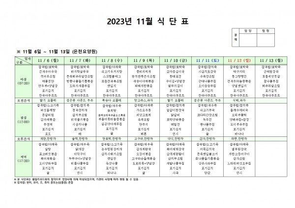 11월 둘째주 식단표 페이지 정보 작성자 은천노인복지회 작성일23-11-02 17:19 조회35,431회 댓글0건 관련링크 이전글 다음글 목록 답변 본문 . 이전글 다음글 목록 답변