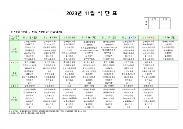 11월 셋째주 식단표 페이지 정보 작성자 은천노인복지회 작성일23-11-10 13:17 조회35,184회 댓글0건 관련링크 이전글 다음글 목록 답변 본문 . 이전글 다음글 목록 답변