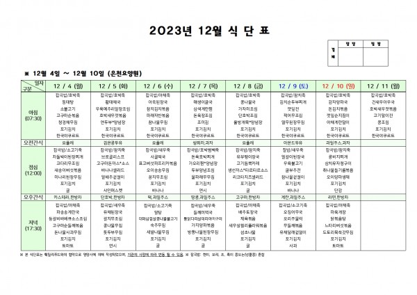 12월 둘째주 식단표 페이지 정보 작성자 은천노인복지회 작성일23-12-01 16:35 조회31,459회 댓글0건 관련링크 이전글 다음글 목록 답변 본문 . 이전글 다음글 목록 답변