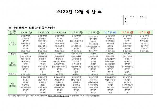 12월 넷째주 식단표 페이지 정보 작성자 은천노인복지회 작성일23-12-15 11:21 조회33,283회 댓글0건 관련링크 이전글 다음글 목록 답변 본문 . 이전글 다음글 목록 답변