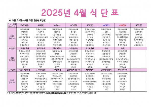 2025년 4월 첫주 식단표 페이지 정보 작성자 은천노인복지회 작성일25-03-28 10:25 조회10,451회 댓글0건 관련링크 이전글 다음글 목록 답변 본문 . 이전글 다음글 목록 답변