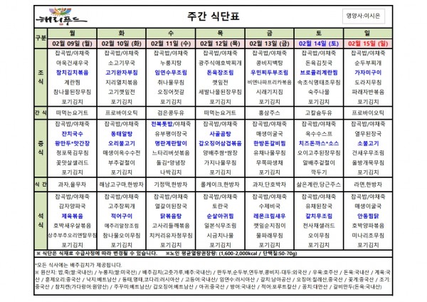 2월 둘째주 식단표 페이지 정보 작성자 은천노인복지회 작성일26-02-06 11:17 조회720회 댓글0건 관련링크 이전글 다음글 목록 답변 본문 2월 둘째주 어르신 식단표 안내해 드립니다. 정성과 영양을 담아 준비하겠습니다. 이전글 다음글 목록 답변