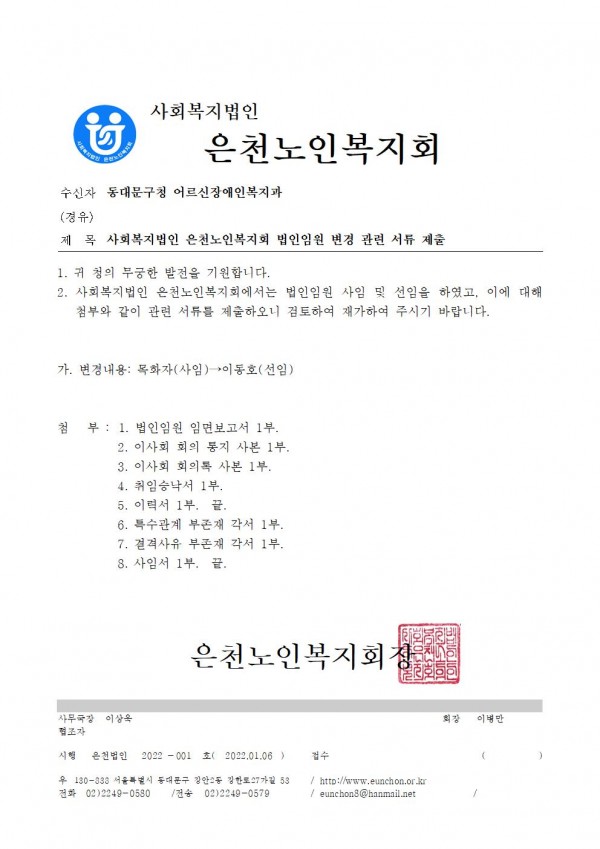 사회복지법인 은천노인복지회 법인 임원 변경 페이지 정보 작성자 은천노인복지회 작성일22-01-06 13:54 조회29,056회 댓글0건 관련링크 목록 본문 사회복지법인 은천노인복지회 법인임원이 아래와 같이 변경되었습니다. 변경내용: 목화자(사임)->이동호(선임) 목록