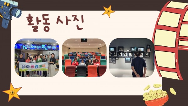 [서울시동대문구재가노인복지기관] 5월 문화체험활동 '영화관람' 페이지 정보 작성자 은천노인복지회 작성일25-06-11 14:39 조회2,777회 댓글0건 관련링크 이전글 다음글 목록 답변 본문 촬영소 사거리에 위치한 '답십리영화미디어아트센터'에서 영화 관람을 진행하였습니다! 이전글 다음글 목록 답변