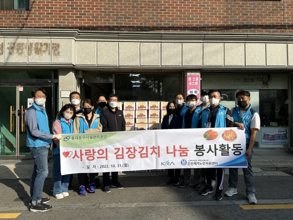 동대문구 시설관리공단 임직원 10명이 봉사활동에 참여하여 각 어르신 댁에 방문하여 김장김치를 직접 전달하여 더욱 의미 있는 시간이 되었고 어르신들께서 만족도가 높았습니다.