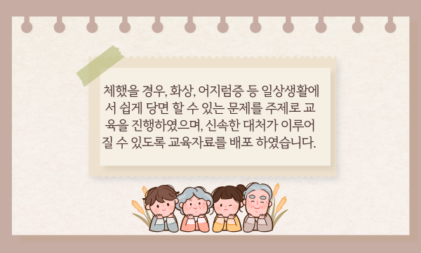 [재가노인서비스] 대상자교육_응급처치교육 페이지 정보 작성자 은천노인복지회 작성일22-03-03 11:43 조회18,884회 댓글0건 관련링크 이전글 다음글 목록 답변 본문 은천재가노인지원센터 대상자 어르신들에게 응급처치교육을 진행하였습니다. 이전글 다음글 목록 답변