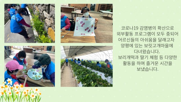 [재가노인지원] 봄 나들이 페이지 정보 작성자 은천노인복지회 작성일22-06-03 17:15 조회17,993회 댓글0건 관련링크 이전글 다음글 목록 답변 본문 재가노인지원센터 어르신들과 양평 보릿고개마을로 나들이를 다녀왔습니다. 이전글 다음글 목록 답변