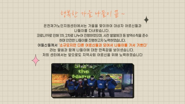 [재가노인지원서비스] 2021년 가을나들이 페이지 정보 작성자 은천노인복지회 작성일21-12-15 16:01 조회19,988회 댓글0건 관련링크 이전글 다음글 목록 답변 본문 2021년 재가노인지원서비스 대상 어르신 가을나들이 이전글 다음글 목록 답변