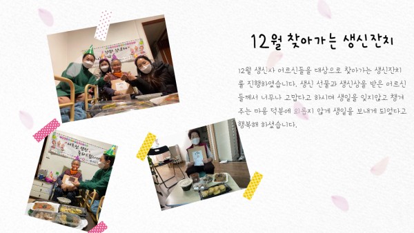 [재가노인지원서비스 ] 12월 찾아가는 생신잔치 페이지 정보 작성자 은천노인복지회 작성일21-12-31 13:32 조회19,711회 댓글0건 관련링크 이전글 다음글 목록 답변 본문 12월 찾아가는 생신잔치 이전글 다음글 목록 답변